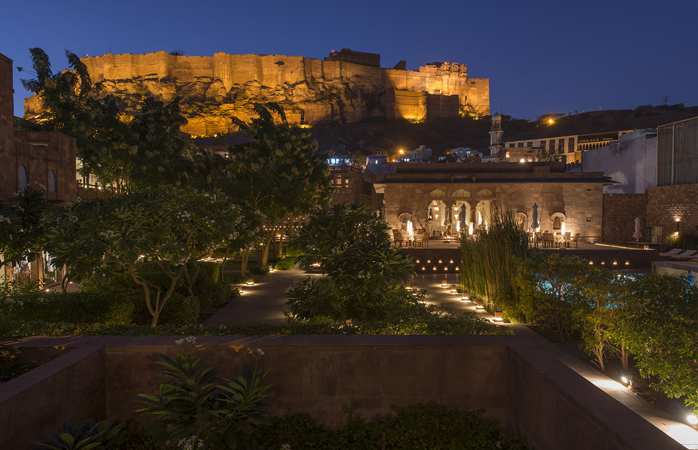 Darikhana: The alfresco dining option. Perched on the first floor, above the old stables, this dining venue offers clear views of the Mehrangarh Fort. Evening meals at Darikhana are some of our most popular, where you can see the illuminated fort above and the candlelit Haveli courtyard below. Meals are made from fresh, seasonal, organic herbs and vegetables picked from our chef’s garden.