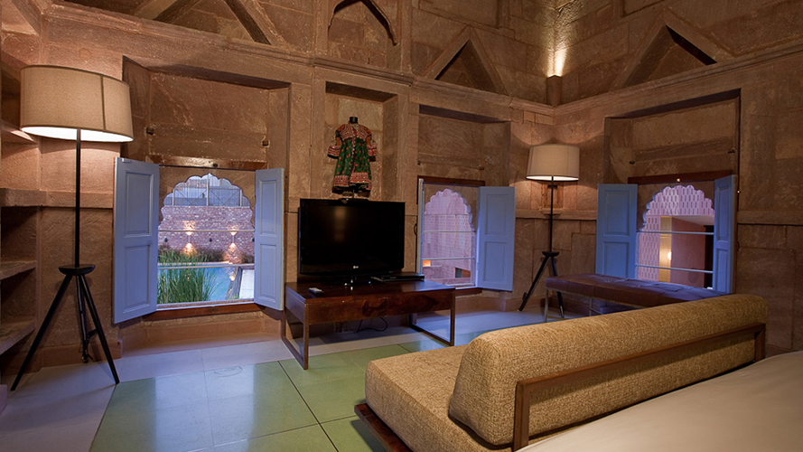 The hotel has forty rooms and suites, each of which had been constructed to distinctive design principles. The signature style balances the historic charm of the original Rajput residence and the sleekness and simplicity of contemporary design.